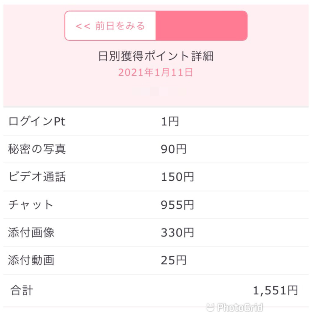 上記の明細に「添付画像」という項目がありますが、これは女性が送った画像を男性が見たことでポイントが加算されたものです。